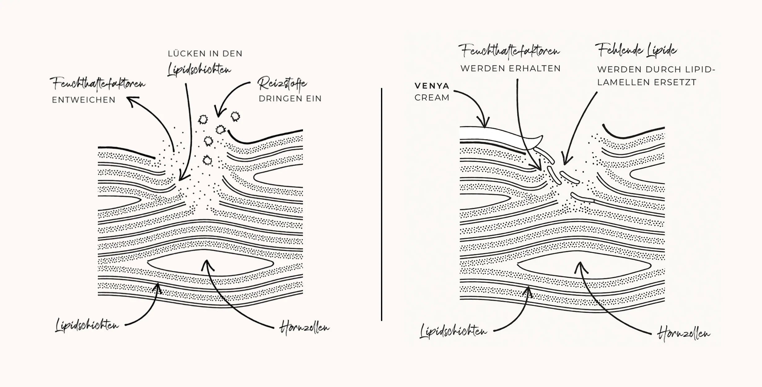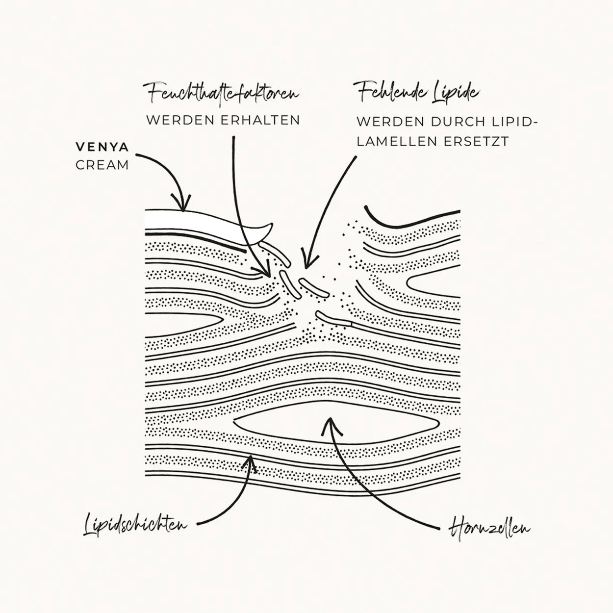 Die Komposition unserer VENYA Cremes ist diesem Bauplan der biologischen Hautbarriere nachempfunden. Hautidentische Lipide und Ceramide bilden eine lamellenartige Struktur, die die Regeneration der Hautbarriere unterstützt und ihre Schutzfunktion erhöht. So bleibt die Feuchtigkeit in der Haut sicher bewahrt, während freie Radikale erfolgreich abgewehrt werden.