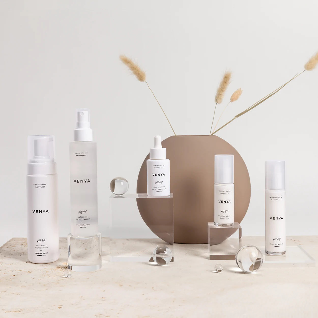 Alle VENYA Produkte bringen mit ihren biomimetischen und pH-sauren Rezepturen die Haut zurück in ihr natürliches Gleichgewicht – denn genau das ist es, was sie für ein Healthy Aging braucht. Die Pflegelinie setzt auf eine einfache, intuitive Anwendung, die in fünf Schritten morgens und abends durchgeführt werden kann.