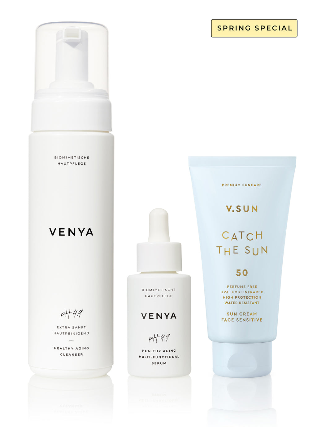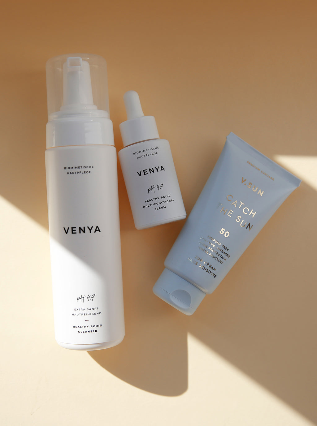 V.SUN FACE CREAM SPF 50 PERFUME FREE: AQUA, C12-15 ALKYL BENZOATE, BUTYL METHOXYDIBENZOYLMETHANE, GLYCERIN, DICAPRYLYL ETHER, ETHYLHEXYL SALICYLATE, CETYL ALCOHOL, GLYCERYL STEARATE, ETHYLHEXYL TRIAZONE, BIS-ETHYLHEXYLOXYPHENOL METHOXYPHENYL TRIAZINE, PENTYLENE GLYCOL, DIETHYLHEXYL BUTAMIDO TRIAZONE, SODIUM STEAROYL GLUTAMATE, PHENYLBENZIMIDAZOLE SULFONIC ACID, BUTYROSPERMUM PARKII BUTTER, CAPRYLYL GLYCOL, ECTOIN, DECYLENE GLYCOL, TOCOPHERYL ACETATE, XANTHAN GUM, PIROCTONE OLAMINE, SODIUM HYDROXIDE, SODIUM HYALURONATE, ALOE BARBADENSIS LEAF JUICE POWDER